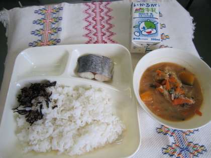 本日の献立はさごしの塩焼き、みそ汁、牛ひじきそぼろでした。