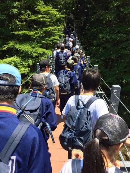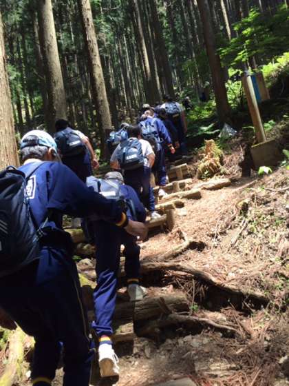 少し気温は高いですが、みんな元気に登っていきます。脱落者が出ないように互いに声をかけて頑張りましょう。