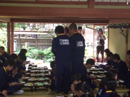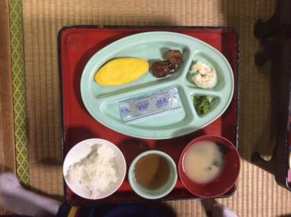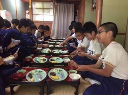 朝食の様子です。今日は班別活動を行います。しっかりと食べて、洞川の自然と歴史をめぐりましょう。いただきます。