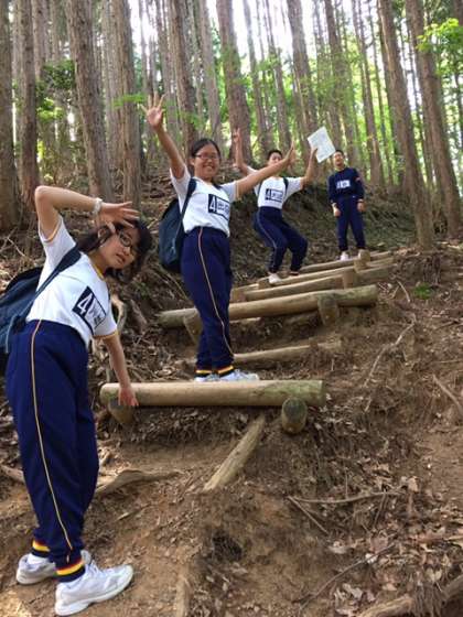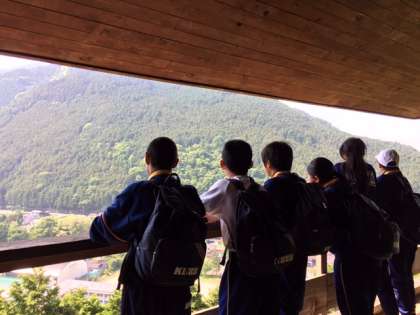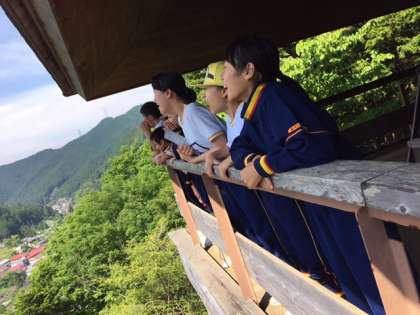展望台では、みんなで「山びこ」に挑戦しました。「ヤッホー」という声がかえってきました。大成功です。かりがね橋や面不動にも聞こえたようです。