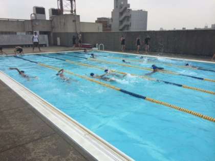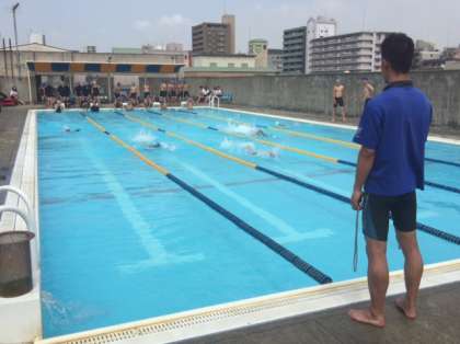2年体育の授業の様子です。水泳の授業です。準備運動の後、クロールで25mを何本か流してからタイムを計りました。かなり速い生徒もいてますね〜。水泳部かな。