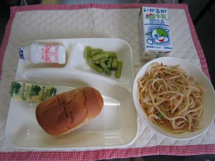 本日の献立はシーフードトマトスパゲッティ、グリーンアスパラガスのサラダ、半減黒糖ロール、はっ酵乳でした。