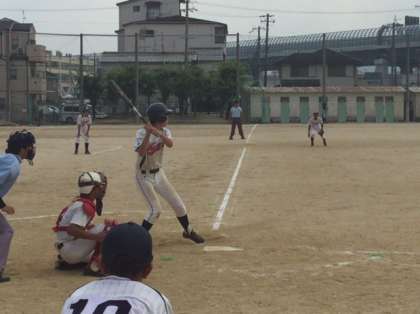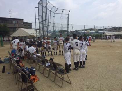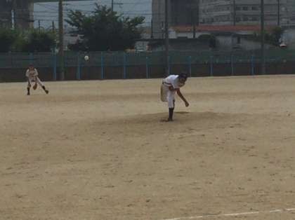 7月16日、大阪中学校軟式優勝野球大会の2回戦が門真ニ中のグランドで行われました。本校の対戦相手は平田中です。前半、効果的にタイムリーが出て、3点をリードしました。