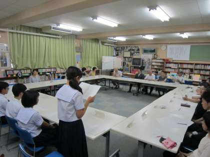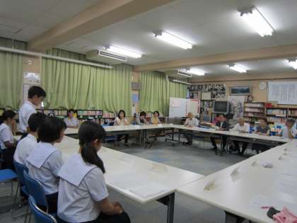3時より図書室で『子どもの生活を考える会』が開催されました。第1部では学校の様子を地域の方々に報告しました。第2部として、生徒会役員も参加して、現在の生徒会活動の様子や、課題などを報告・相談し、地域の方々にアドバイスをもらいました。