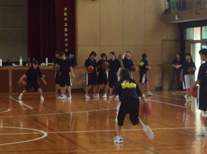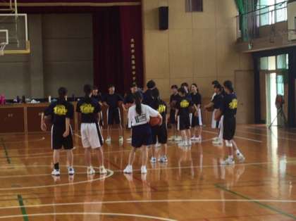 午後の体育館では女子バスケットボール部が活動しています。体育館も暑くなっていますね〜。適当な休憩をはさんで練習してください。