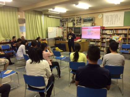 本日、14時から図書室において、教職員対象に救急救命講習を実施しました。天王寺消防署より講師を招き、講義と救命法の実践を行いました。