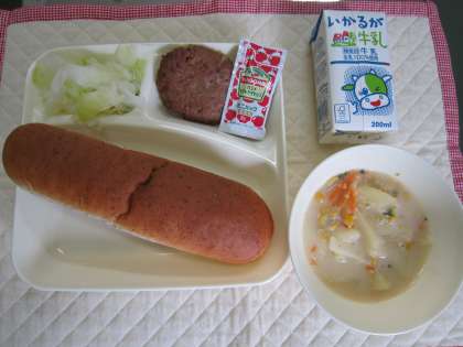 本日の献立は焼きハンバーグ、豆乳コーンスープ、ボイルキャベツ、ライ麦コッペパンです。