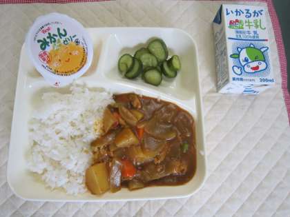 本日の献立はチキンカレーライス(米粉)、きゅうりのピクルス、みかんゼリーです。