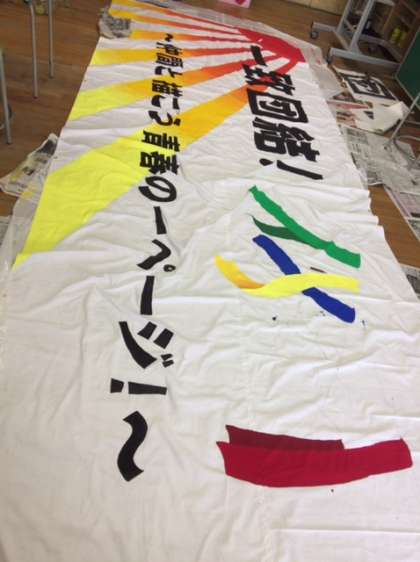 体育大会・文化祭のテーマを描いた横断幕を美術部の生徒が作成してくれています。完成間近ですね〜。
