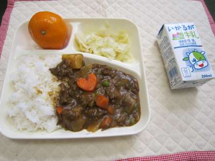 本日の献立はビーフカレーライス、キャベツのピクルス、みかん(冷)です。