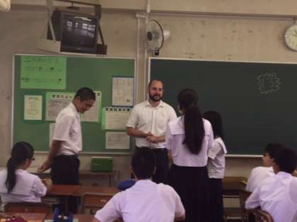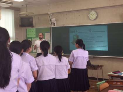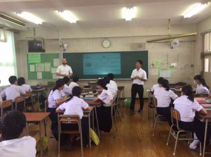 9月6日、2年英語の授業の様子です。Pearce先生とのT.Tです。まずはゲームです。グループで「1」から順番に数字を英語で言い、「13」を言った人が負けです。最高3つまで言えます。作戦がいりますね〜。その後は二組に分かれて、絵を見ながら I use a 〜 to 〜.をうめていくゲームです。早い者勝ちです。楽しく英語を学んでいますね〜。