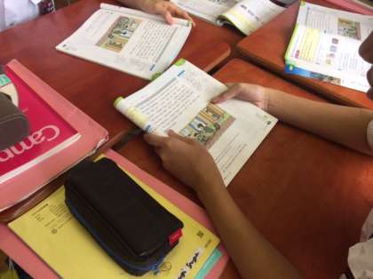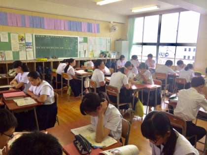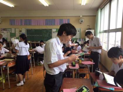 3年英語の授業の様子です。教科書のリーディングです。CDにあわせて読んだり、タイム設定して、リーダーを中心に読んだりと徹底的にリーディングしています。この後、プリントによる文法の学習が始まりました。