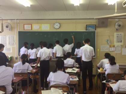 3年国語の授業の様子です。教科書の「花や咲く咲く」という作品を一文ずつ順番に読んだあと、関連するプリントの問題を解いていきました。担当する問題を挙手して決めて黒板に解答を書いていきました。その後、西川先生から解説がありました。