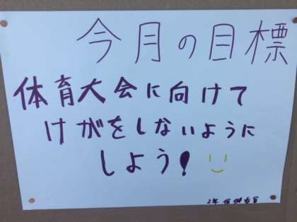 各学年の教室前廊下の掲示板に、9月の保健目標が掲示されています。体育大会に全員参加できるよう日々の活動でケガをしないようにしましょう。