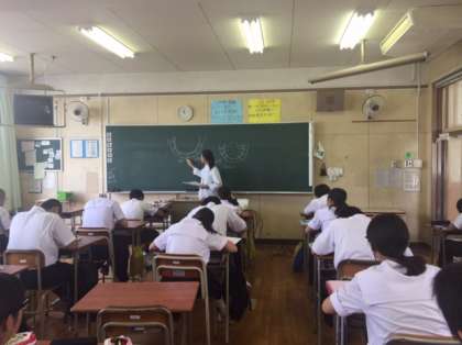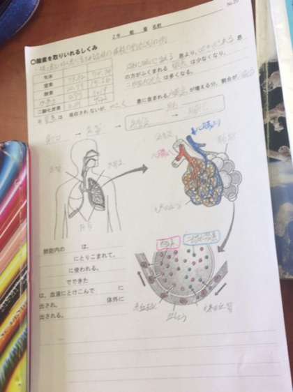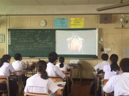 2年理科の授業の様子です。呼吸器のしくみについて学習しています。途中、実際に内視鏡で見た肺の中の映像を見ながらの解説もあり、わかりやすかったです。