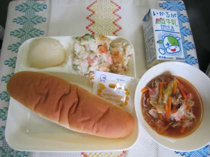 本日の献立はえびグラタン、トマトスープ、コッペパン、なし(二十世紀)でした。