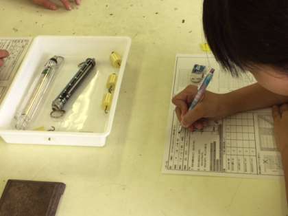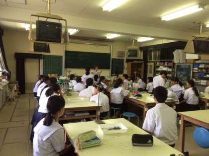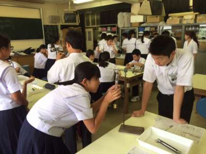 1年理科の授業の様子です。この時間は実験です。「力の大きさとばねののびの関係を調べよう」ということで、ばねにオモリを付けていきながら、ばねののびを調べています。