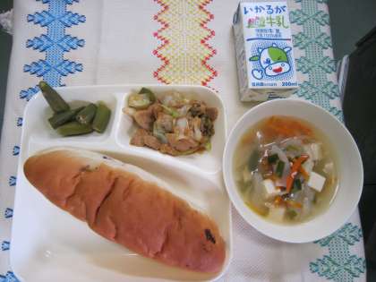 本日の献立はホイコウロー、とうふのスープ、オクラの中華あえ、レーズンパンでした。