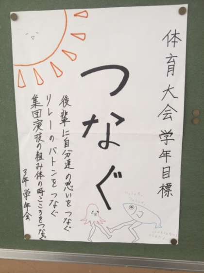 体育大会学年目標が3年教室前の廊下に掲示されています。『つなぐ』です。何をつなぐのか。それは「後輩に自分達の思いをつなぐ」「リレーのバトンをつなぐ」「集団演技の組み体の時、心をつなぐ」としています。3年生は最後の体育大会です。みんなで心をつなぎましょう。