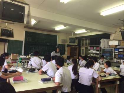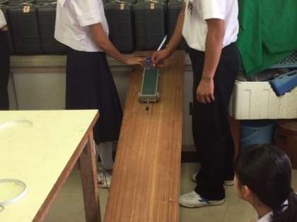 3年理科の授業の様子です。斜面を下る物体や、落下する物体の運動の様子と力との関係を調べよう。ということで、力学台車に紙テープをつけ、台車が斜面を下る様子を記録タイマーで記録していきます。