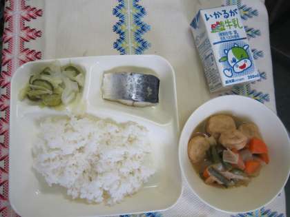 本日の献立はさごしの塩焼き、じゃがいもと一口がんもの煮もの、キャベツときゅうりのゆずの香あえです。