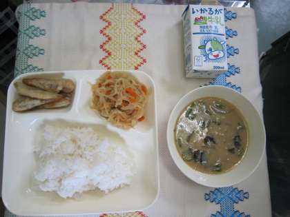 本日の献立はいわしのてんぷら、みそ汁、切り干しだいこんのいため煮です。