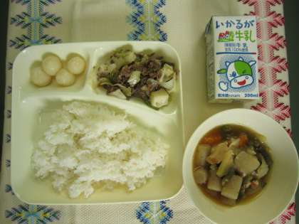 本日の献立は鶏肉とさといもの煮もの、牛肉と野菜のいためもの、みたらしだんごです。今日は、月見の行事献立なので「みたらしだんご」がついていました。お肉、お野菜がたくさん入った栄養満点の給食を食べて午後の部もがんばりましょう。