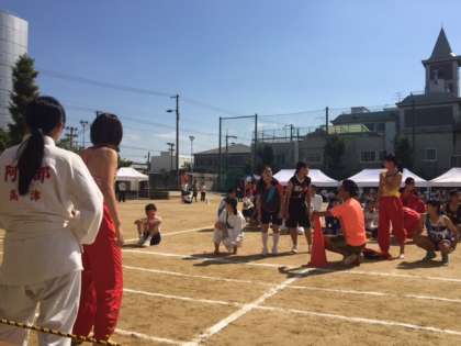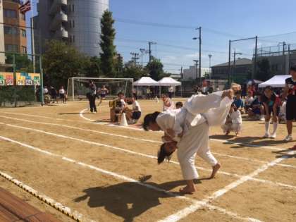 水泳部はジャージがバトンになっています。柔道部はお約束の投げ技バトン。いいですね〜。陸上部のアンカーは全国6位。