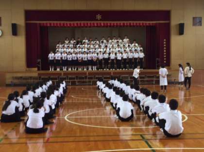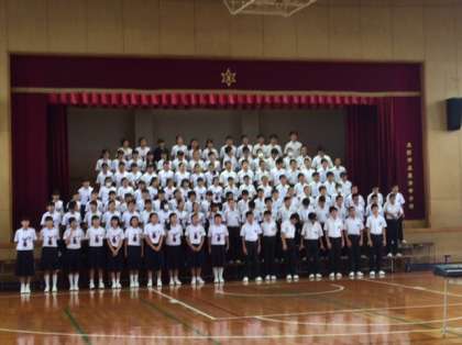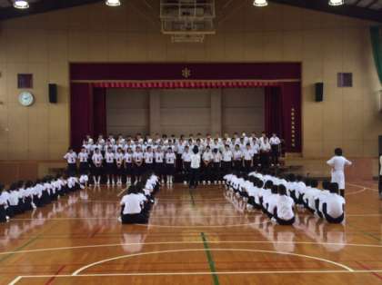1時間目、1年学年集会を行いました。音楽コンクールに向けて、まずは立ち位置の確認を行いました。1・2組が並んだ後に3・4組が並び、最後は全員で整列しました。発声練習も行いました。