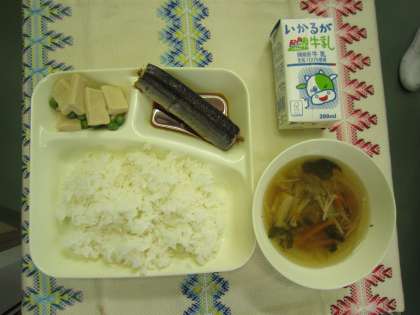 本日の献立はさんまのさんしょう焼き、すまし汁、高野どうふの煮ものです。