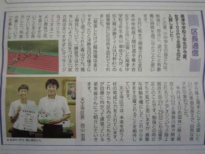 天王寺区広報誌10月号に、本校3年生青山さんが天王寺区長を表敬訪問した時の様子が掲載されています。詳しくは、広報誌「天王寺」10月号デジタルブック版をご覧ください。 http://www.city.osaka.lg.jp/tennoji/page/0000412456.html