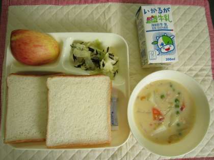 本日の献立はコーンクリームシチュー、キャベツのひじきドレッシング、食パン、りんごです。