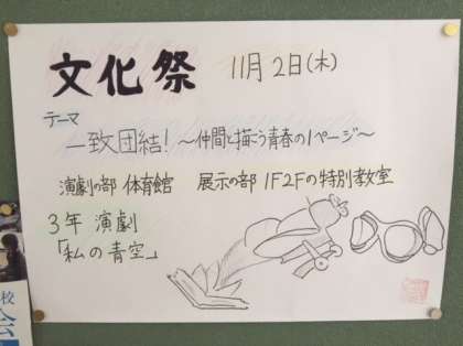 11月2日の文化祭を知らせるポスターが廊下掲示板をはじめ、校舎内に掲示されています。