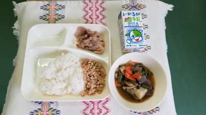 本日の献立は、豚肉のねぎだれかけ、ふきよせ煮、ツナ大豆そぼろです。