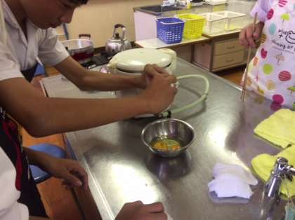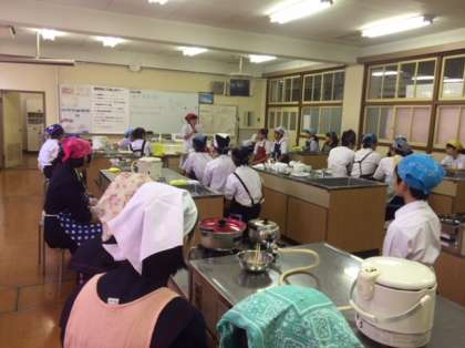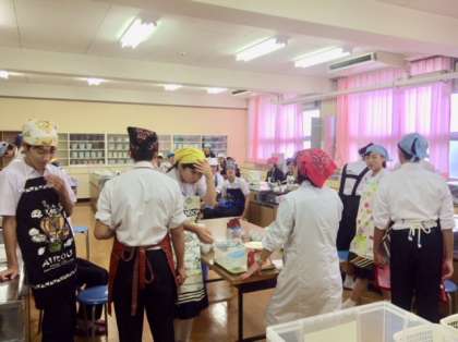 2年家庭科の授業の様子です。調理実習を行っています。今回のメニューは、ハムピラフと卵スープです。