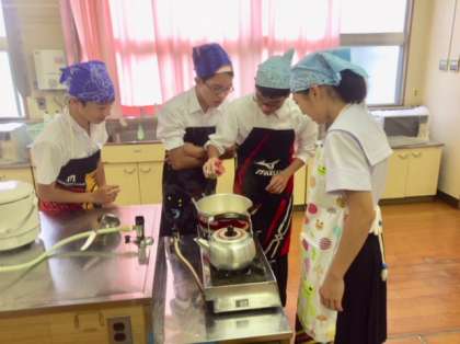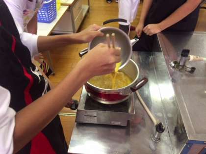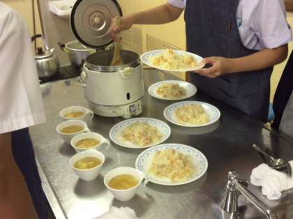 卵も上手く割れ、スープに投入します。なかなか手際の良い生徒もいますね〜。ハムピラフも炊け、スープも完成しました。美味しそうですね〜。