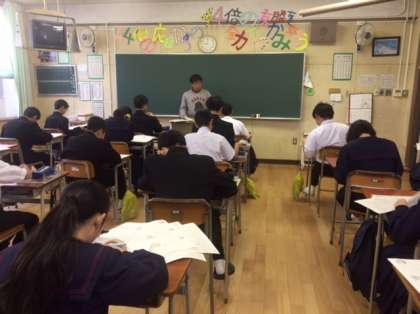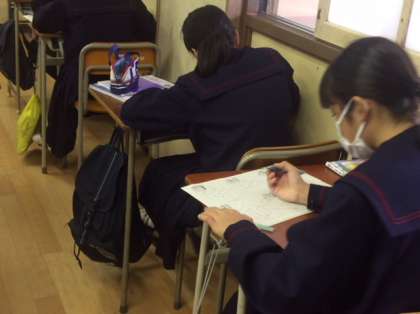 1年技術の授業の様子です。キャビネット図・正投影図を製図しています。説明をよく聞いて正確に作業しましょう。
