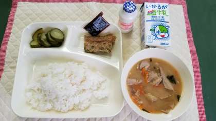 本日の献立は、お好み焼き、豚汁、きゅうりの梅風味、はっこう乳です。
