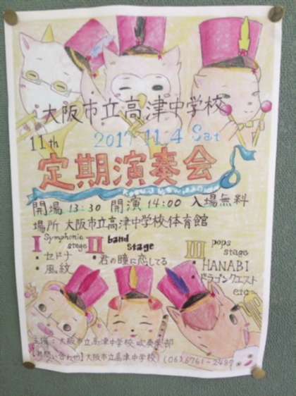 校内のいたるところに今年度の吹奏楽部定期演奏会の開催を知らせるポスターが掲示されています。11月4日(土)本校体育館において14時開演となっています。たくさんの方々のご来場をお待ちしております。