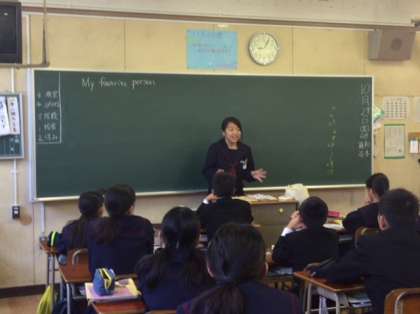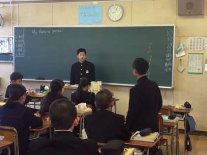 1年英語の授業の様子です。My favorite personを英語で紹介した後、質問を受けて英語で答えます。質問はできるだけ疑問詞を使って行うようにします。なかなか会話が成立してよかったと思います。