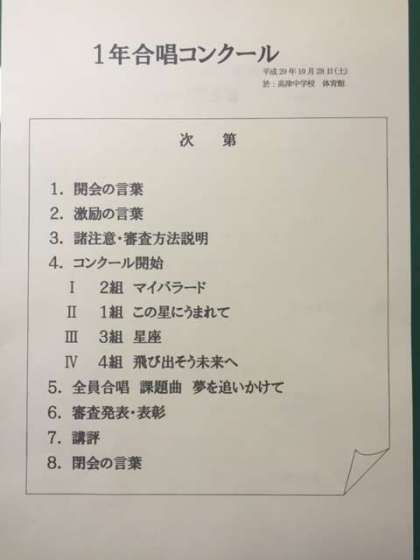 10月28日(土)1年合唱コンクールを開催します。開演は9時30分です。1年生は、これまで一生懸命練習してきました。応援よろしくお願いします。