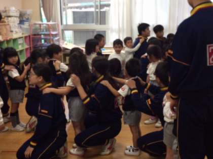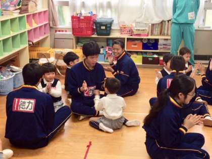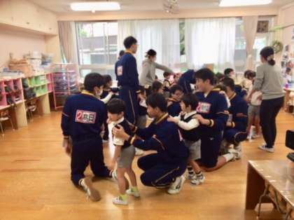 3年生の皆さんは、中学校では見せない表情で園児と遊んでいます。かわいいんでしょうね〜。