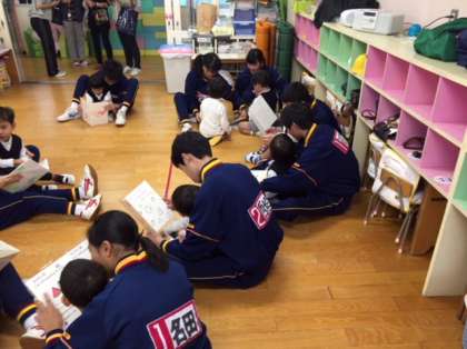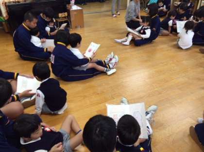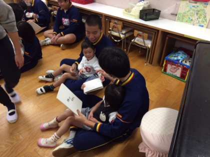 最後は手作り絵本の読み聞かせをしました。ひざの上に乗せたりしながら、優しく読んであげています。いい体験ができましたね。来週は3・4組が味原幼稚園を訪問します。