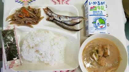 本日の献立は、焼きししゃも、みそ汁、きんぴらごぼう、焼きのりです。