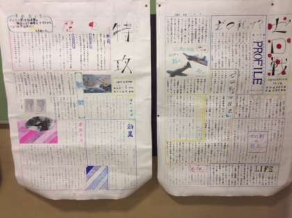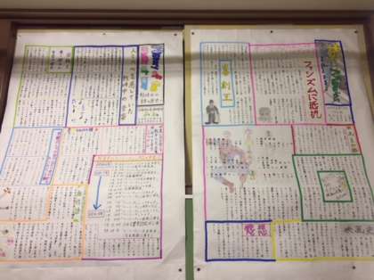 文化祭当日は舞台上にありましたので、皆さんに見ていただくことはできませんでした。新聞の内容はよく調べらた中身の濃いものですので、是非とも多くの人にご覧いただけるよう、現在図書室の前に掲示しています。懇談や参観などで来校された際にご覧いただければ幸いです。よろしくお願いします。