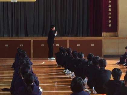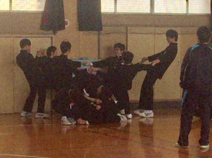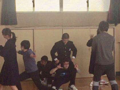 最後は「イメージ・だるまさんが転んだ」で、出されたテーマを身体で表現してストップモーションを決めるというイメージトレーニング的なものも行いました。劇団「空晴(からっぱれ)」から6人の劇団員を招いた今回の授業は、将来身につけなければならないことをゲームなどを通して楽しく笑いの中で学べたことは有意義でした。劇団員の皆さん、ありがとうこざいました。