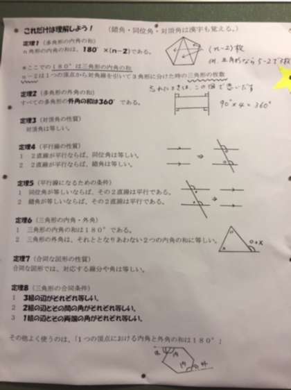 2年生の廊下の掲示板に「これだけは理解しよう!」として、三角形の合同条件や多角形の角度に関する事などの定理が8つ掲示されています。最低限これだけは覚えてほしいものです。繰り返し確認しましょう。