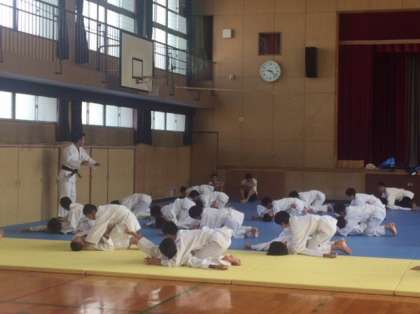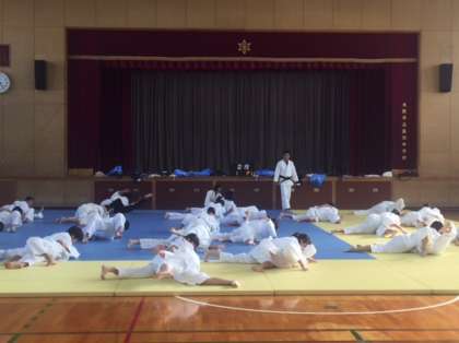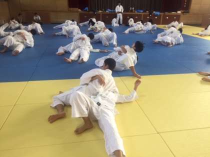 2年体育の授業の様子です。柔道の授業です。袈裟固めなどの寝技の練習を繰り返し行っています。1対1の対戦は、熱が入りますね。