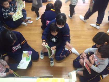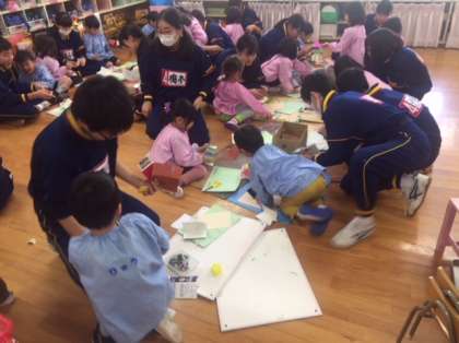 作品作りがひと段落したところは、絵本の読み聞かせをしている生徒が出てきて、全体に広がっていきました。園児も楽しそうに聞いていました。