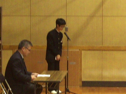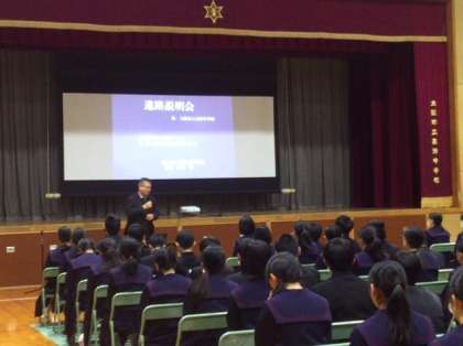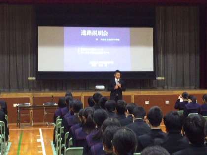 本日5時間目の授業参観で、3年生は公立高等学校説明会を行いました。生徒の司会で始まり、大阪府立夕陽丘高等学校の先生より高等学校普通科のお話をしていただきました。
